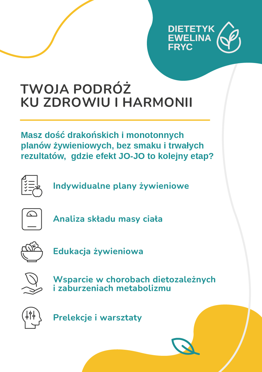 Cześć! Nazywam się Ewelina Magiera-Fryc jestem dietetyczką z pasją do zdrowego stylu życia i wspierania innych w osiąganiu ich celów zdrowotnych. Od wielu lat pomagam moim Pacjentom lepiej zrozumieć potrzeby swojego organizmu, budować zdrowe nawyki żywieniowe i cieszyć się pełnią życia. W mojej pracy stawiam na indywidualne podejście, bo każdy z nas jest inny, ma inne cele, potrzeby i wyzwania. Współpracuję zarówno z osobami chcącymi zadbać o swoją sylwetkę, jak i z tymi, które borykają się z chorobami dietozależnymi, zaburzeniami metabolicznymi czy nietolerancjami pokarmowymi. Poza codzienną pracą w gabinecie, prowadzę prelekcje i warsztaty, dzieląc się wiedzą na temat zdrowego odżywiania z większym gronem odbiorców. Moją misją jest pokazanie, że zmiana stylu życia może być prosta, smaczna i przyjemna. Zapraszam Cię do wspólnej podróży po zdrowie! 😊
